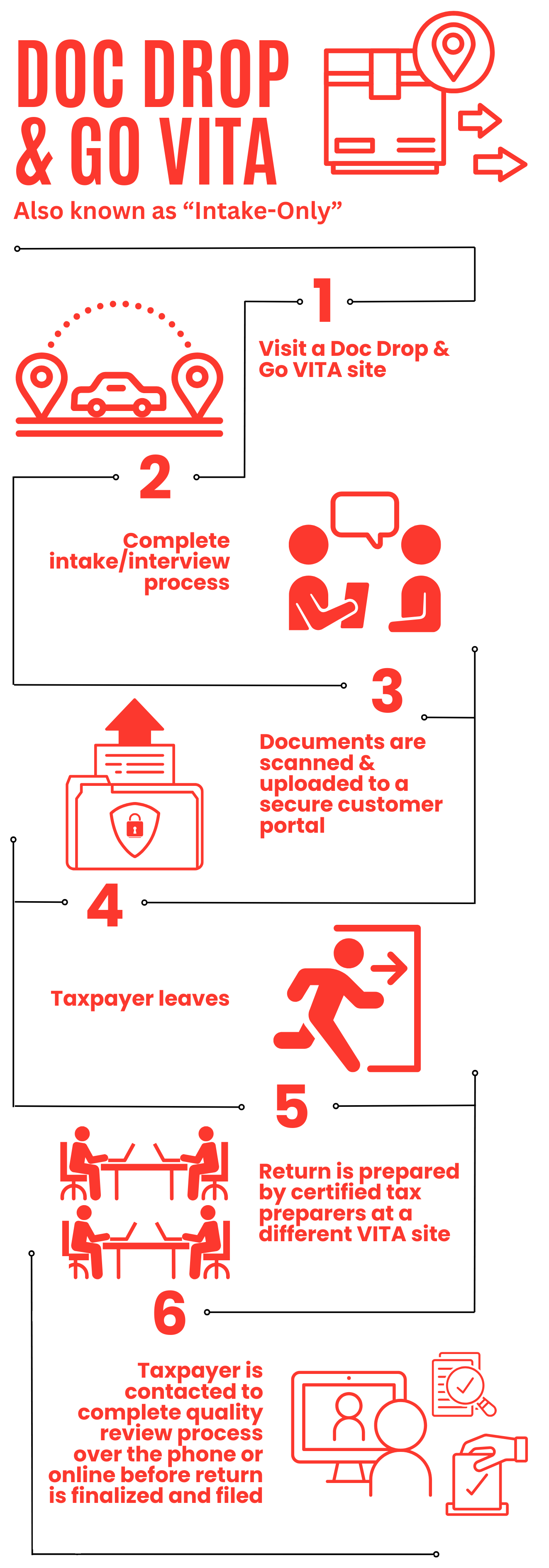 There are four options to choose from when using our VITA services. Doc Drop & Go VITA is our drop-off tax prep option, offering a mix of in-person and virtual tax services. Taxpayers complete an initial 20-30 minute intake at a VITA site, then documents are scanned and uploaded for virtual preparation. The process takes 7-10 days, with quality review done over the phone or online. These sites are walk-in only.