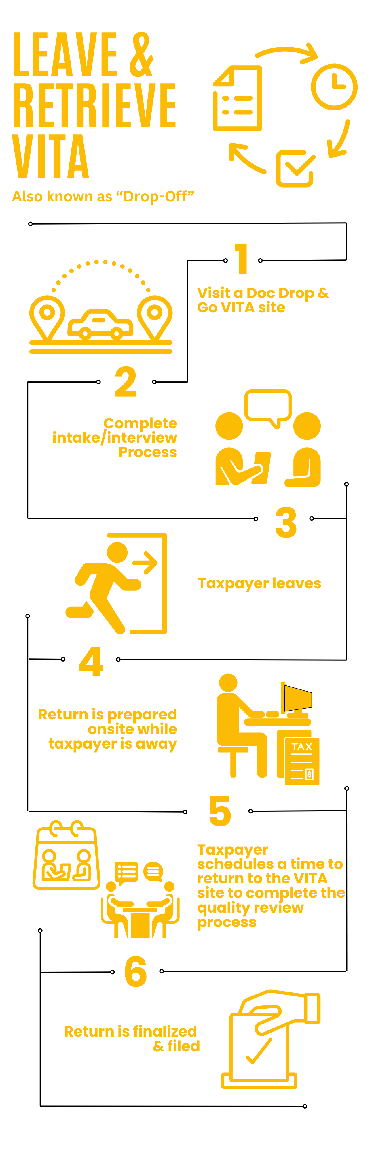 Taxpayers have four different options to choose from when accessing our Volunteer Income Tax Assistance (VITA) program. Our Leave & Retrieve VITA option offers in-person tax preparation where taxpayers complete a 20-30 minute intake, leave their documents, and return later for quality review and document retrieval before finalizing the return.